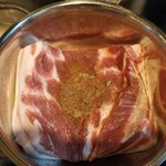 久々にベーコンの仕込み。市場で買った豚バラ肉が1200gもあるデカすぎる肉塊だった。塩、砂糖、胡椒、各種スパイスで1週間漬け込む。本番の燻製はそれからだ。 https://twitter.com/ajing25/status/1119598291413397505/photo/1