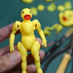 100円ショップで買ってきたミニサイズの「ぷかぷかアヒル」10個を細かく切って針金でつないで全身が動く人形を作りました。 前に作った通常サイズと記念撮影。 https://twitter.com/kami_robo_yasui/status/1284118201584906242/photo/1